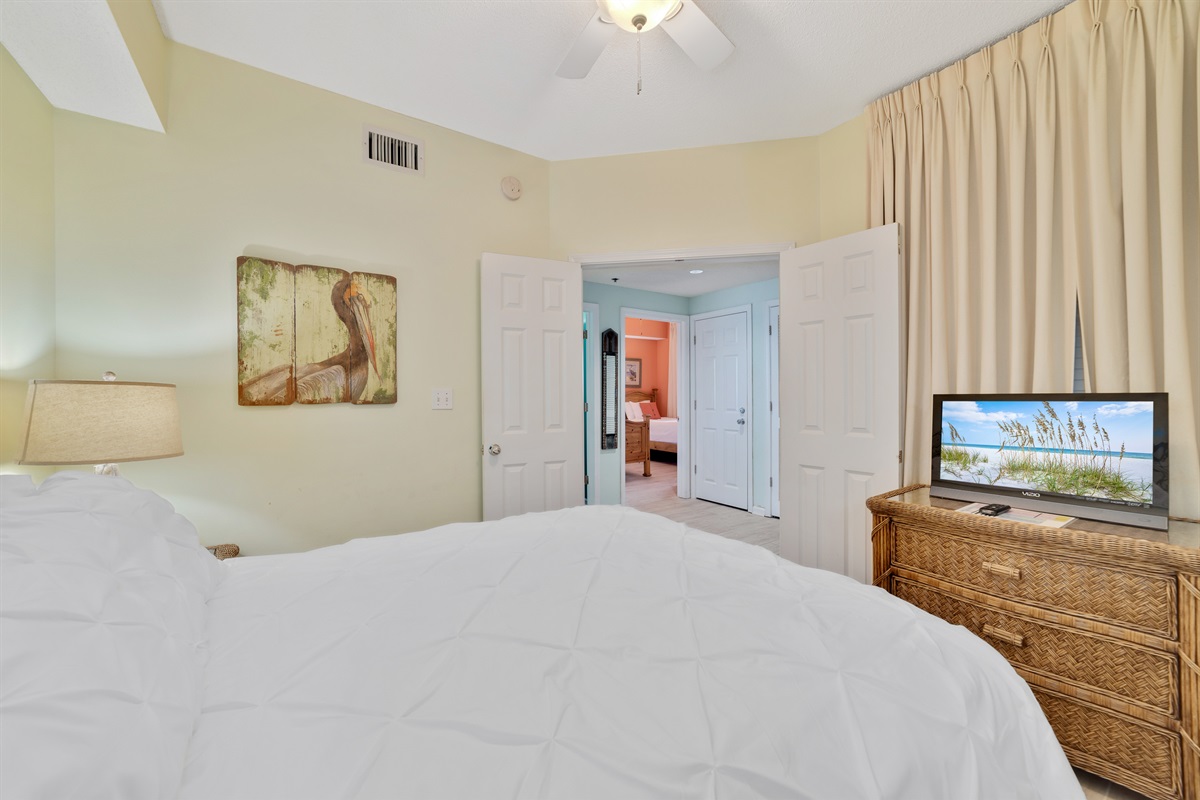 The king-sized primary bedroom boasts a flat-screen TV and private balcony access, allowing you to unwind with the soothing sounds of the waves and breathtaking beachfront vistas.