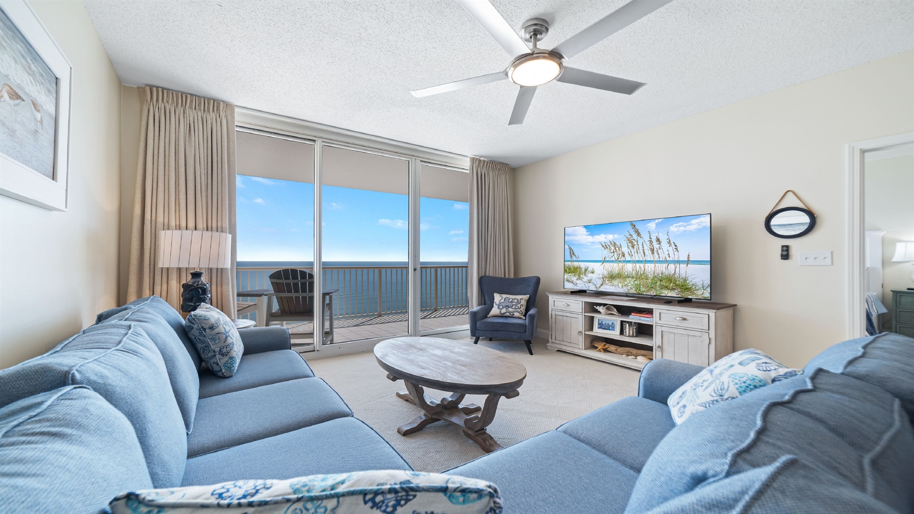📺 Exquisite living area featuring abundant seating, a large, high-definition television, and breathtaking vistas of the Gulf.