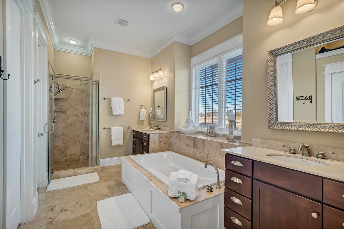 👑 Primary suite, featuring a king-size bed, a flat-screen TV, and a spa-inspired bathroom with a walk-in shower, jetted tub, and double vanities.