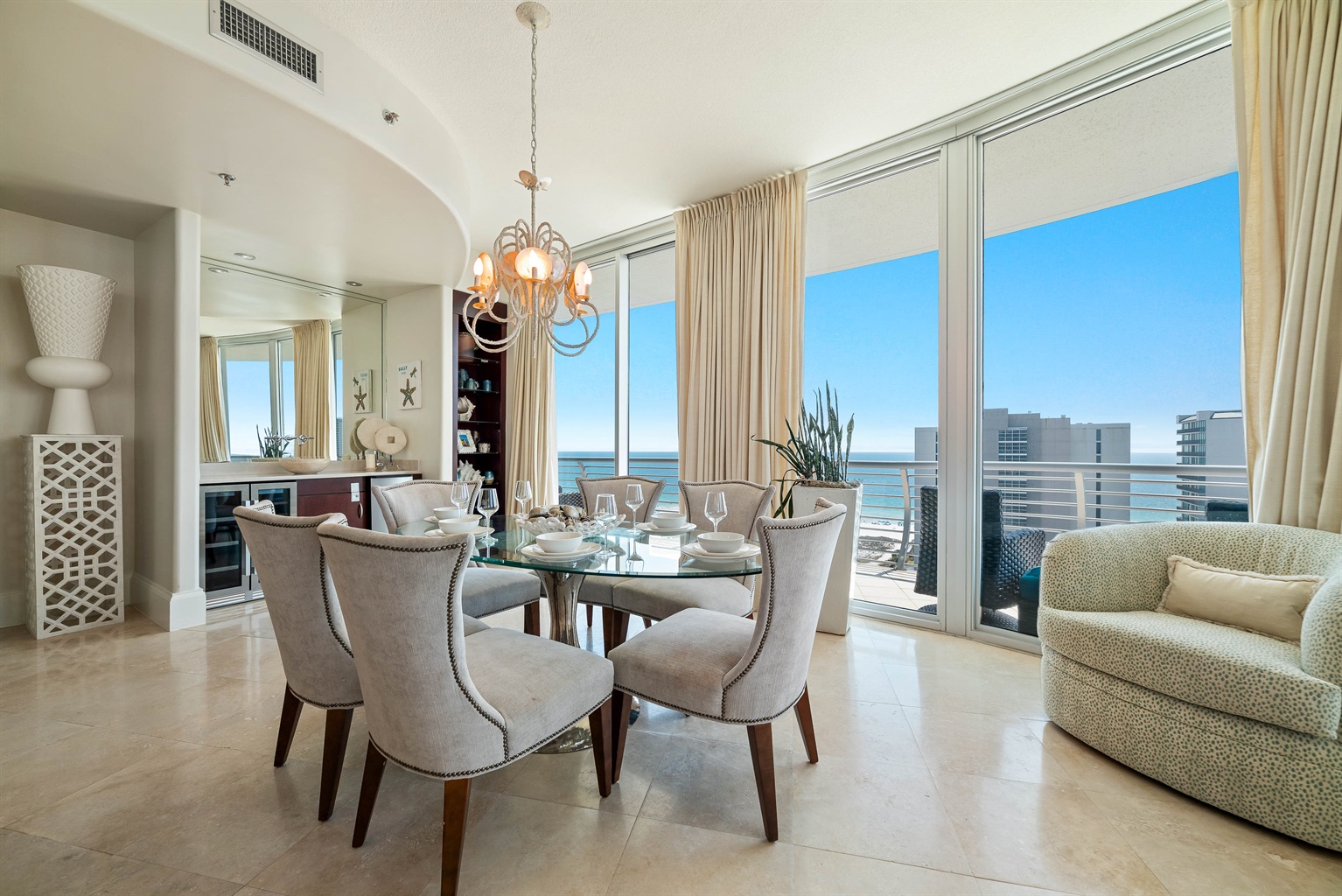 The condo features a stylish wet bar with a top-of-the-line wine cooler and ice maker, adorned with frosted glass - perfect for hosting unforgettable gatherings.