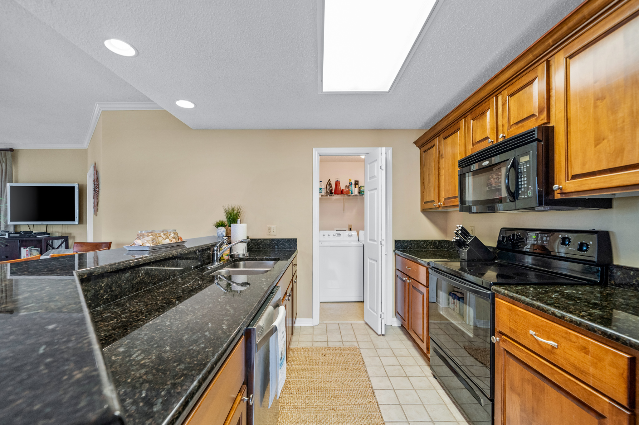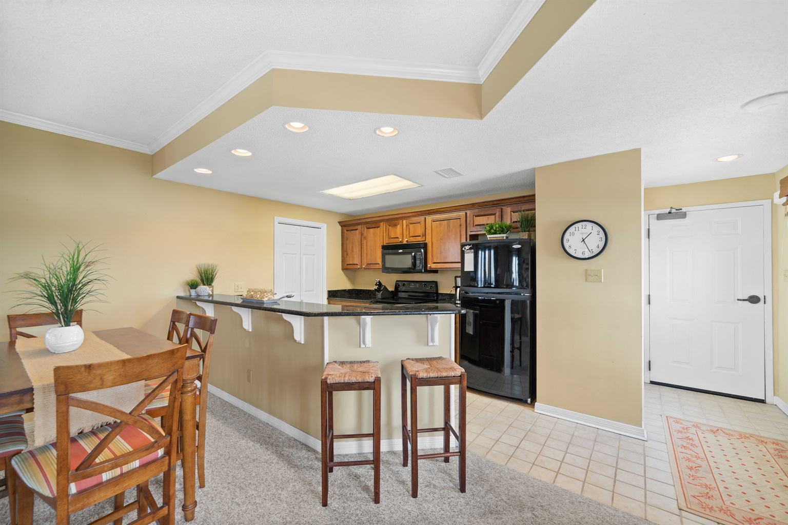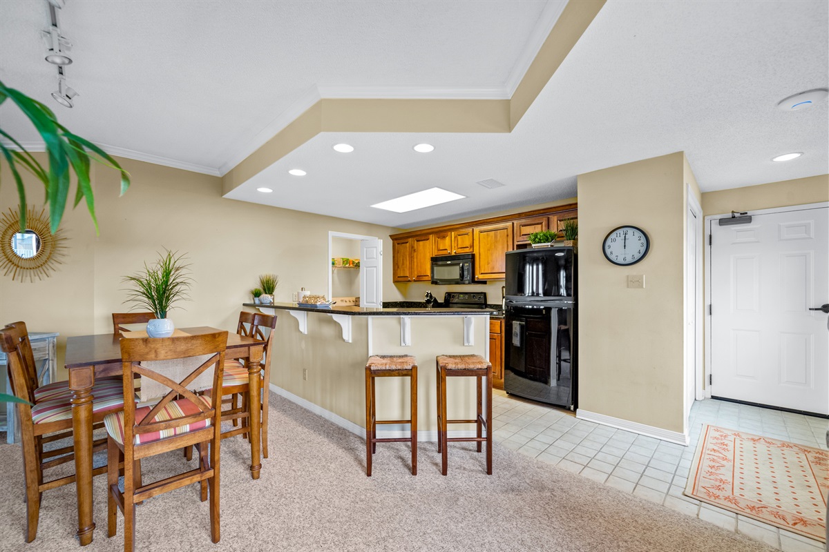 🍳 Gourmet Kitchen equipped with custom wood cabinetry, granite countertops, and a breakfast bar with recessed lighting for a warm, modern feel.