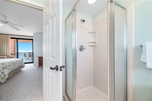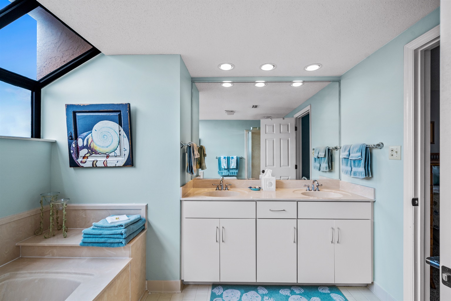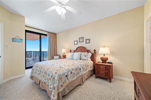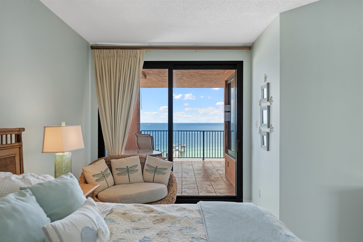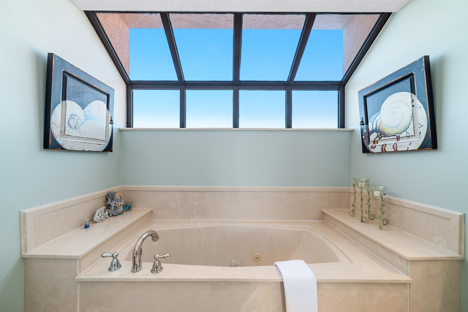 👑 Serene primary suite - a true retreat featuring floor-to-ceiling Gulf views, private balcony access, and a spa-like ensuite with a jetted tub, walk-in closet, and a light-filled vanity area.