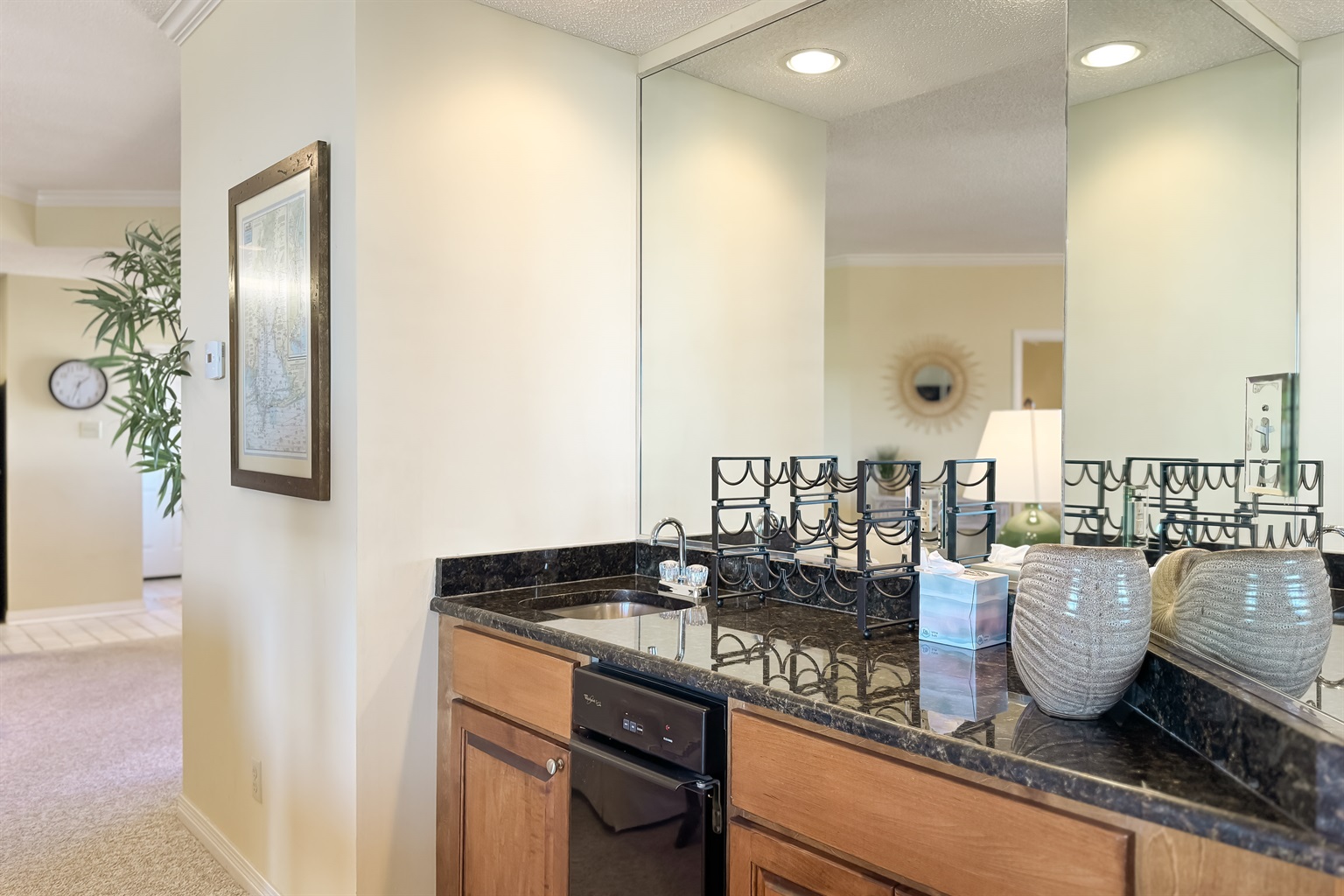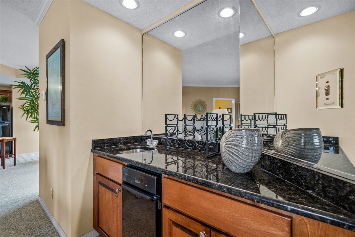 🛋️ The open-concept living area features soaring 8.5-foot ceilings, crown molding, and a granite-topped wet bar with a built-in beverage fridge—ideal for effortless entertaining.