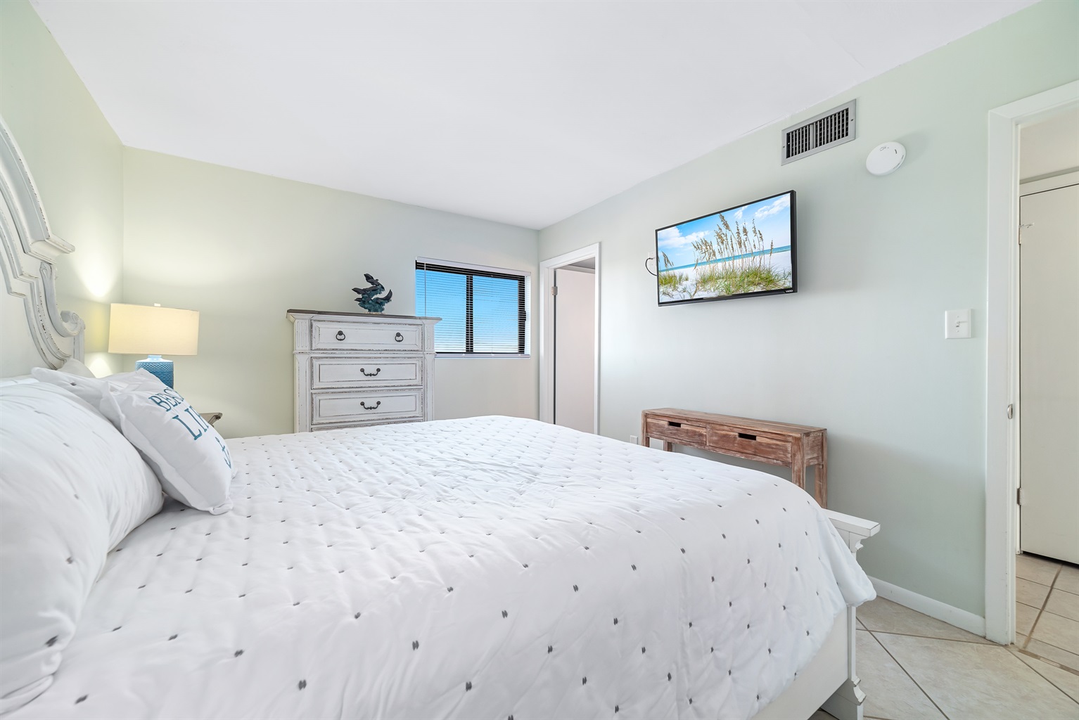 Retire to the opulent primary bedroom featuring a NEW plush king-sized bed, a flat-screen television, and an ensuite bathroom with a shower-tub combination.