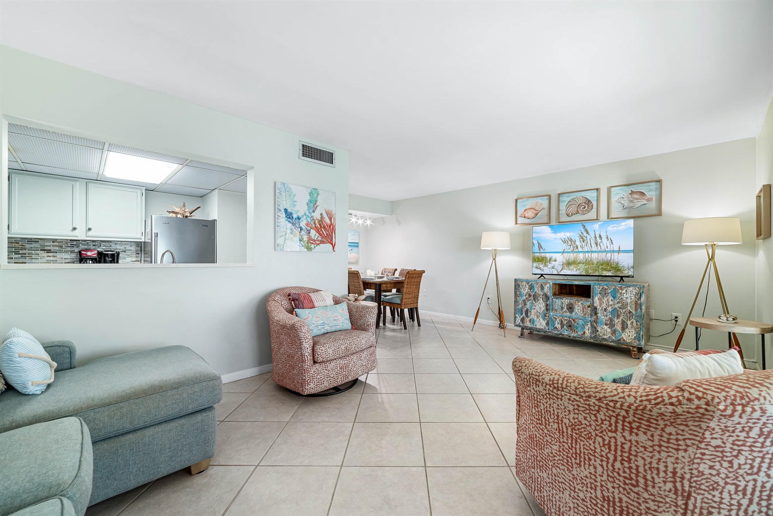 The open-concept living room boasts a large flat-screen television, a queen-size sleeper sofa perfect for additional guests, and direct access to the balcony, inviting you to gather and enjoy the mesmerizing Gulf views.
