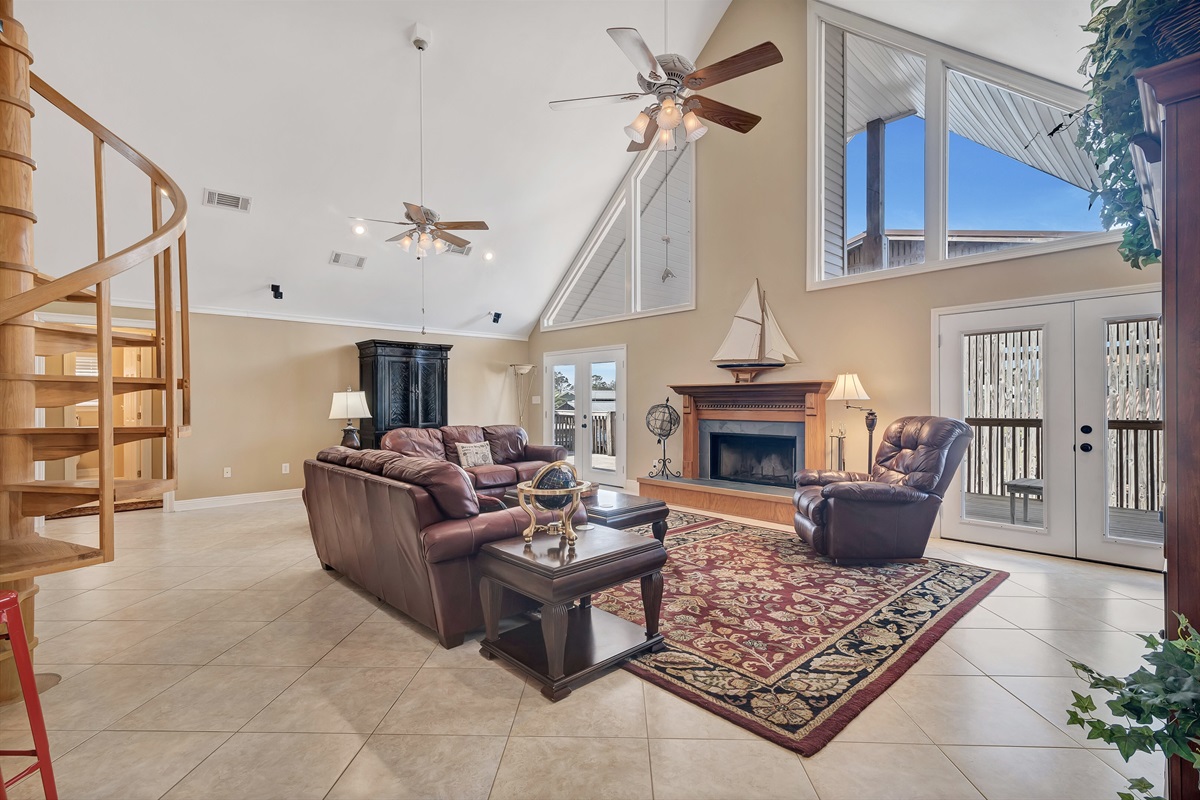 📺 Relax in the grand living room with soaring cathedral ceilings, a cozy fireplace, and a large flat-screen TV for movie nights.