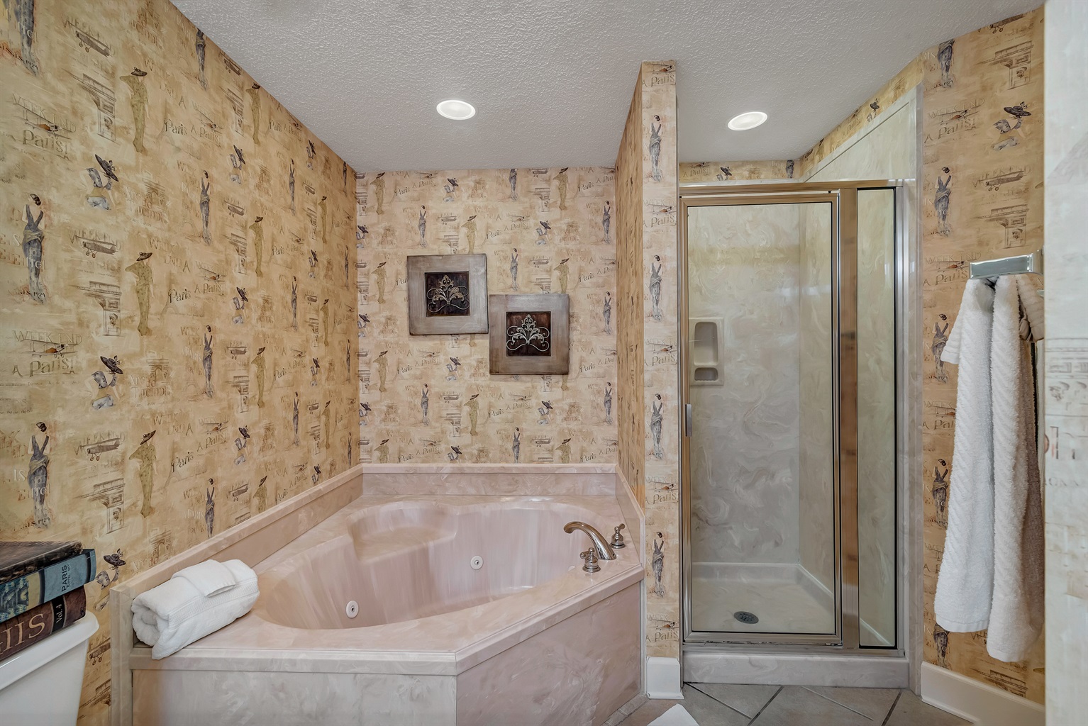 👑 Primary Suite with king-sized bed, ensuite bathroom with double vanities, a walk-in shower, and a jetted tub for ultimate relaxation.